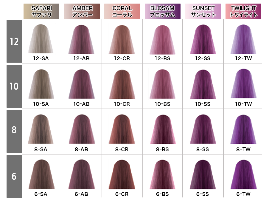 ※ 白100%の髪に基本使用で染めたことを想定したカラーチャートです。