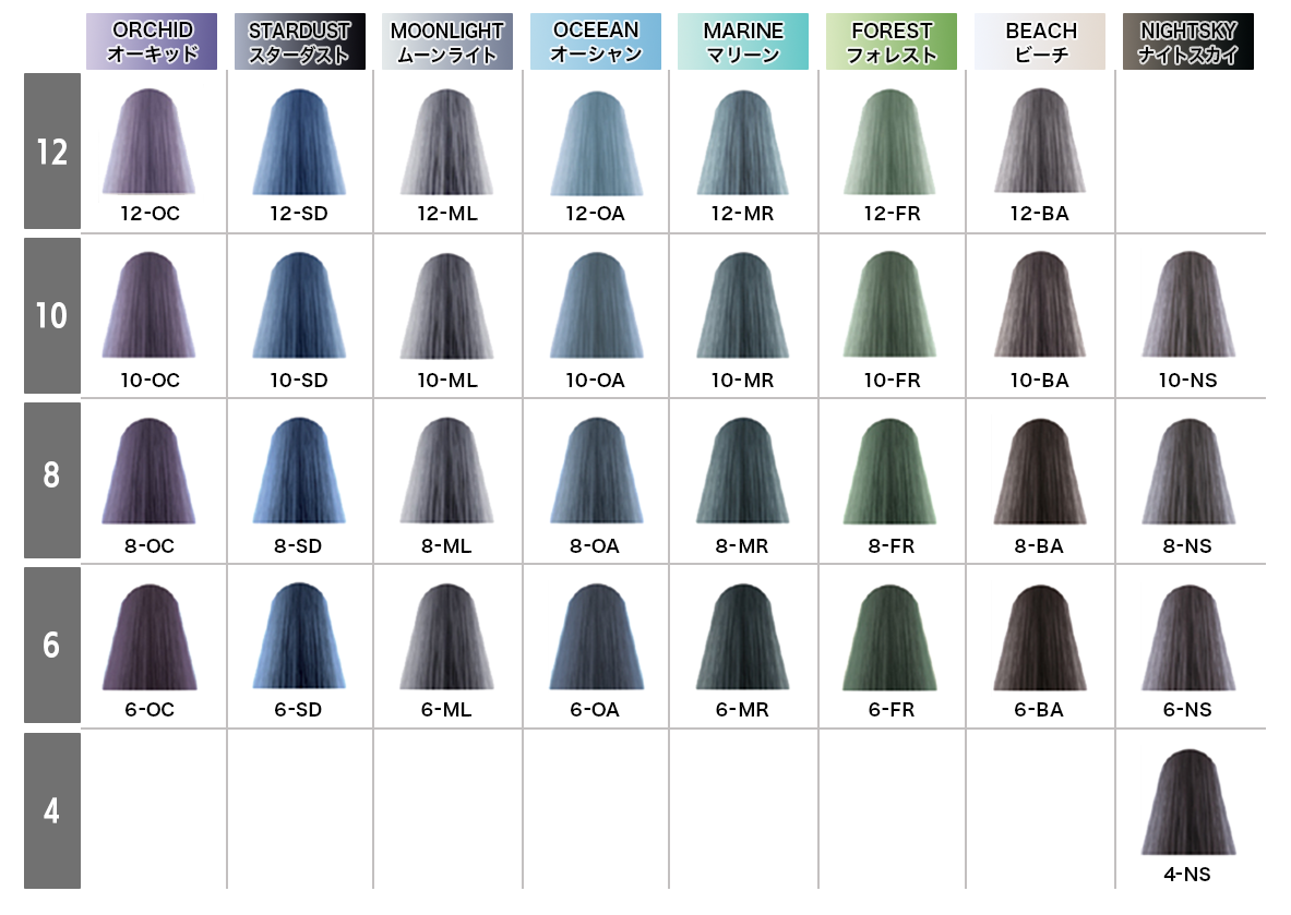 ※ 白100%の髪に基本使用で染めたことを想定したカラーチャートです。