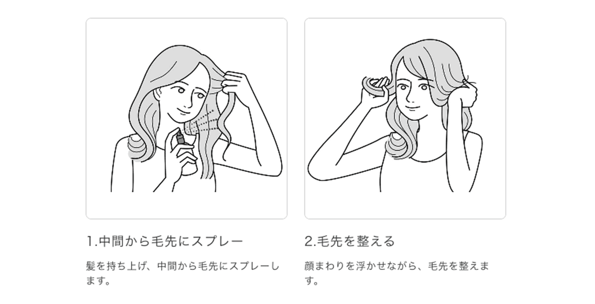 髪を動かしながらスプレーすることで、髪の内側からふんわり感を創ります。
