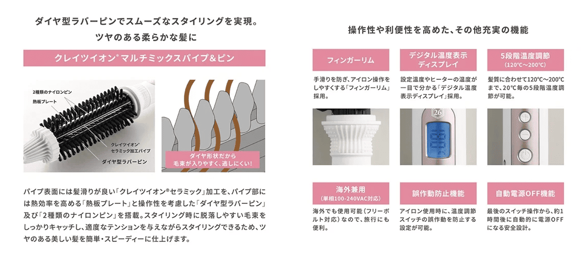 パイプ表面には髪滑りが良い「クレイツイオンセラミック」加工を採用。