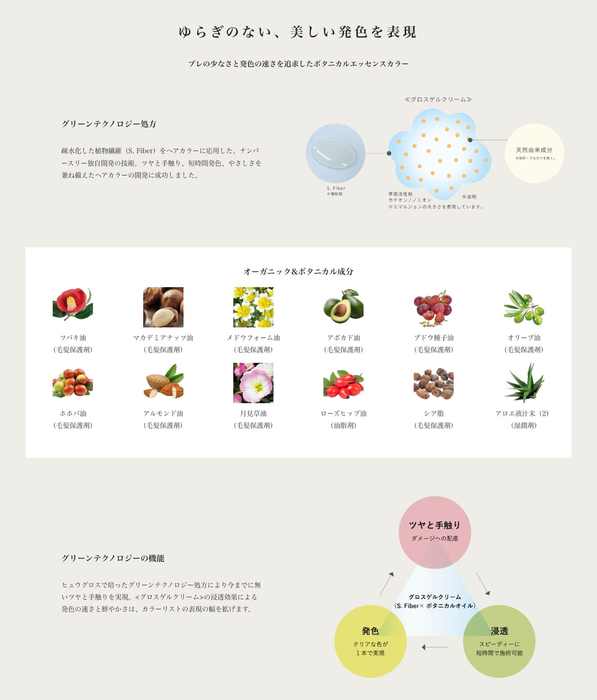 オーガニック&ボタニカル成分を毛髪に浸透させることで、キューティクルを整え、カラーの褪色を防ぎ、ツヤや手触りの質感を感じさせます。