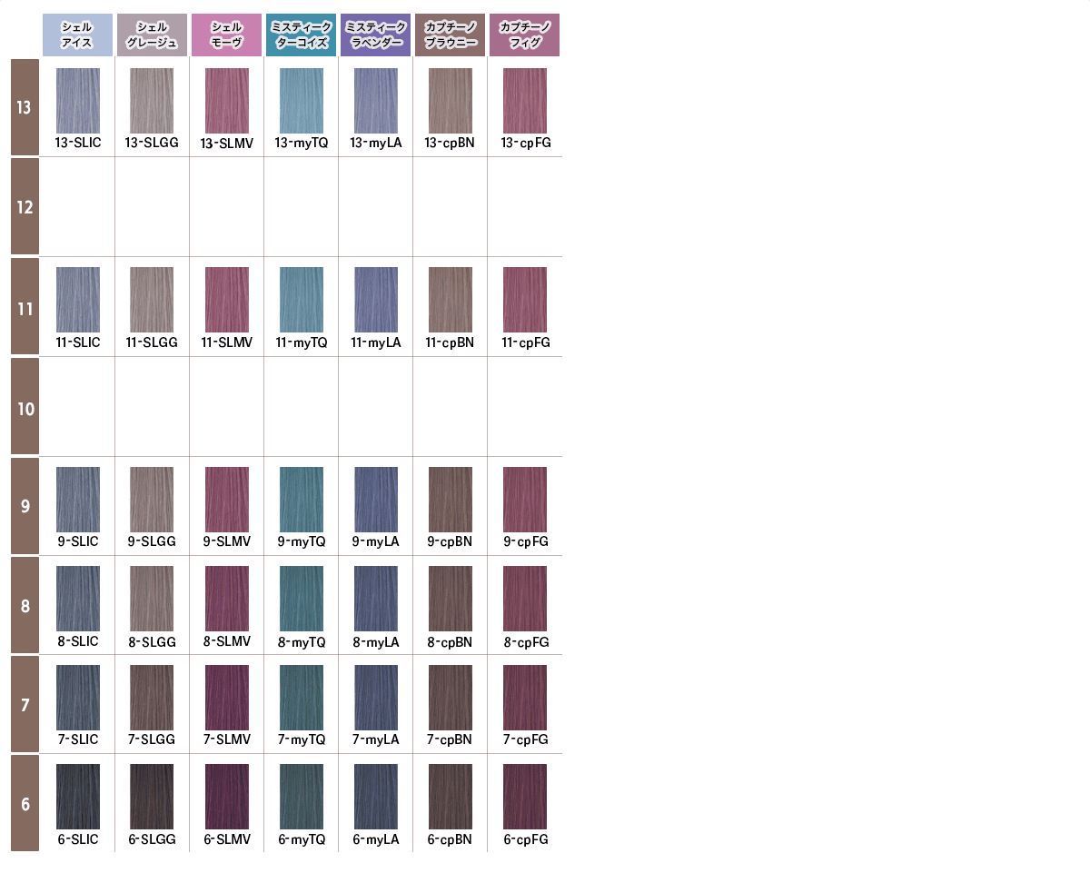 ※ 白100%の髪に基本使用で染めたことを想定したカラーチャートです。