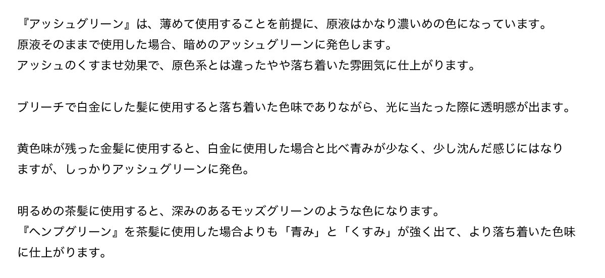 ※ ブリーチ毛対象です。黒髪・白髪の方には効果がございません。 ※ダークシルバー/ココアブラウン/ココナッツブラウン はそのまま原液で使用すると、とても濃い色(暗い)のでご自宅にあるトリートメント(市販のものでもあれば何でもいい)自分の好みに薄めて使用して下さい。