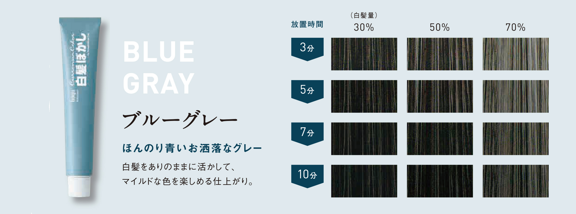 「白髪ぼかし」は、バックグラウンド色がグレーで既染部と新生部の境目が目立たず、 褪色しても赤味が出ません。白髪を隠さずに活かせる淡い色調です。 白髪を完全に隠さず、ほんのりマイルドな色で自然にぼかします。