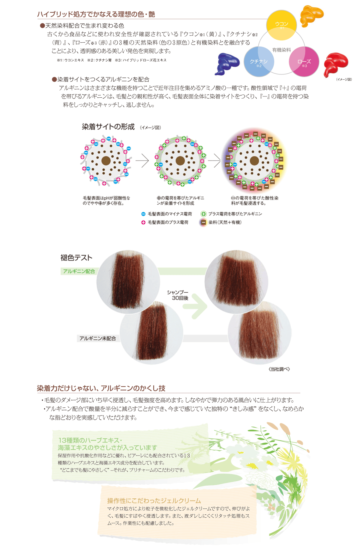天然染料と有機染料を配合するなど、ハイブリッド処方によって、「豊かな発色」「きらめく艶」「安定した染着力」を実感。