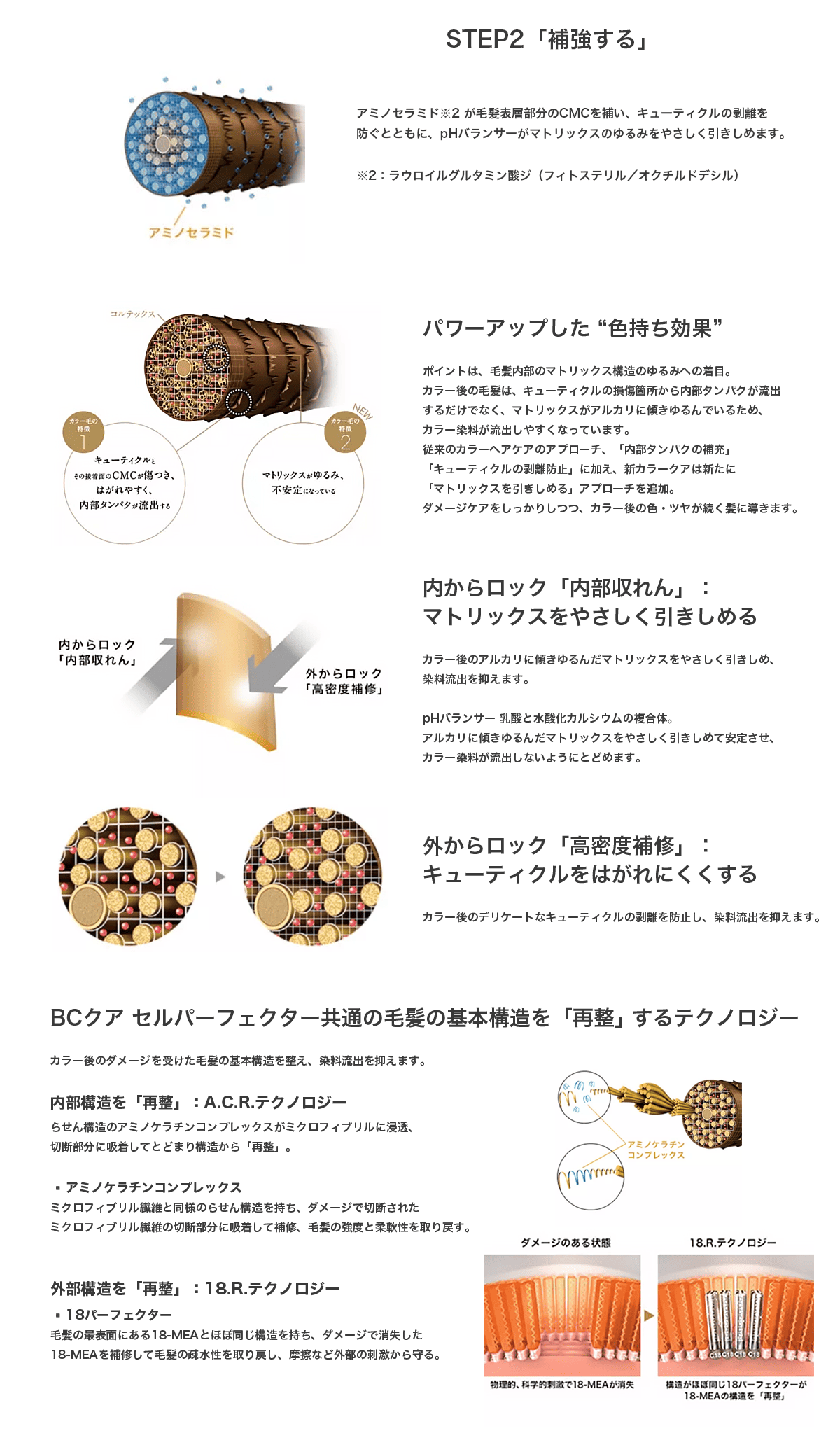 外から補修成分を補充して高密度化するだけでなく、毛髪内部からやさしく毛髪構造を引きしめて、染料流出をブロック。