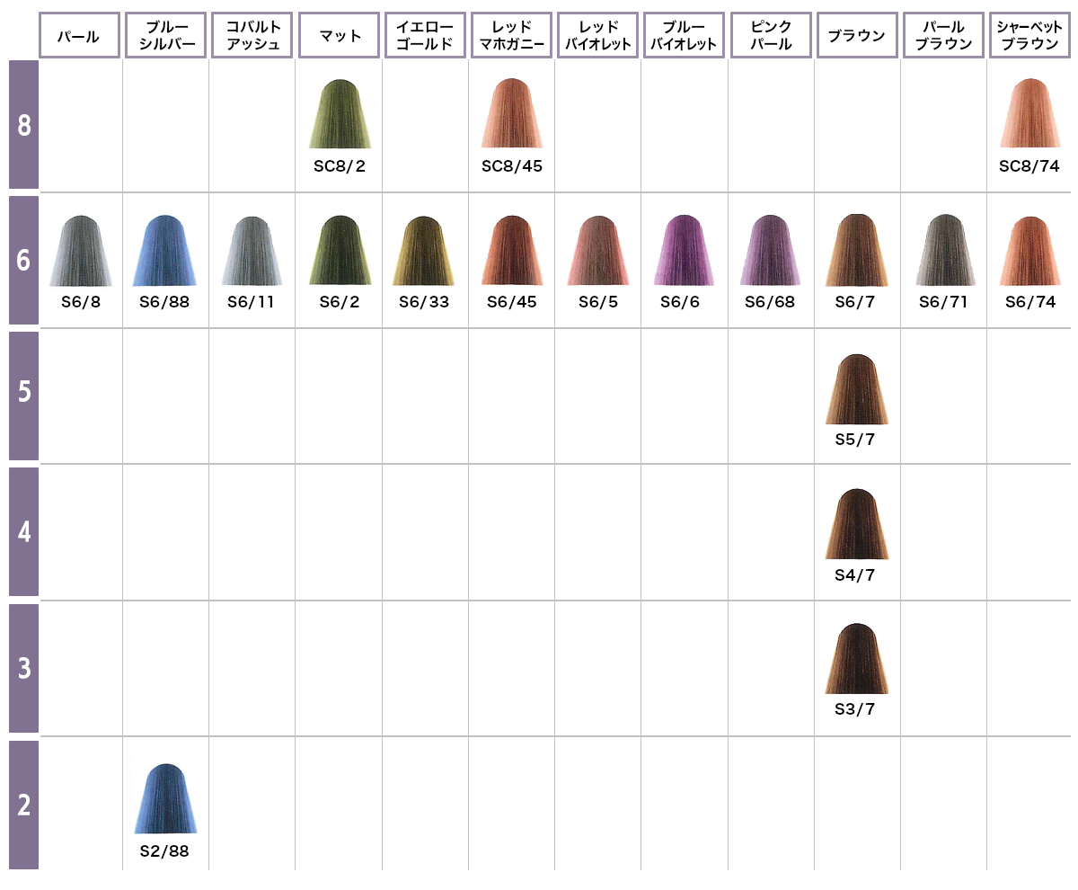 ※ 白100%の髪に基本使用で染めたことを想定したカラーチャートです。