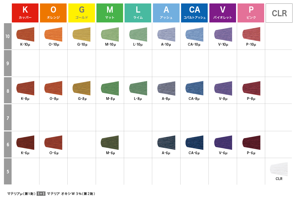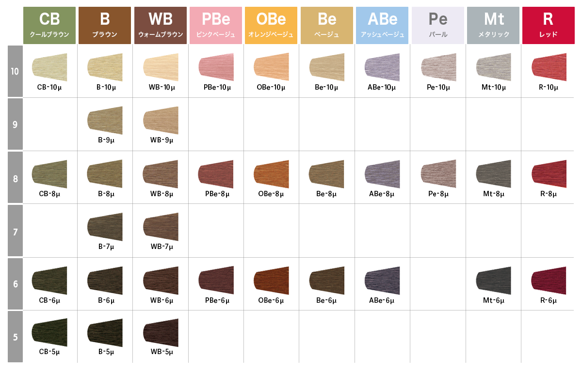 ※ 白100%の髪に基本使用で染めたことを想定したカラーチャートです。