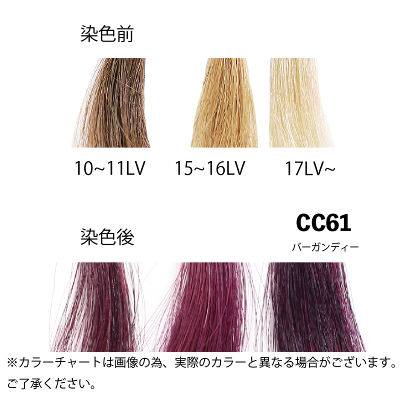 ※ ベースとなる髪色によっては、カラーチャートは実際に使用した際の発色と異なる場合もございます。