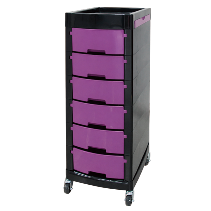 6段の引き出しとオープンスペースをバランスよく備えており、ハサミ・コーム・ブラシ・ドライヤー・カラー用品などの施術ツールを用途ごとに整理・収納できます。