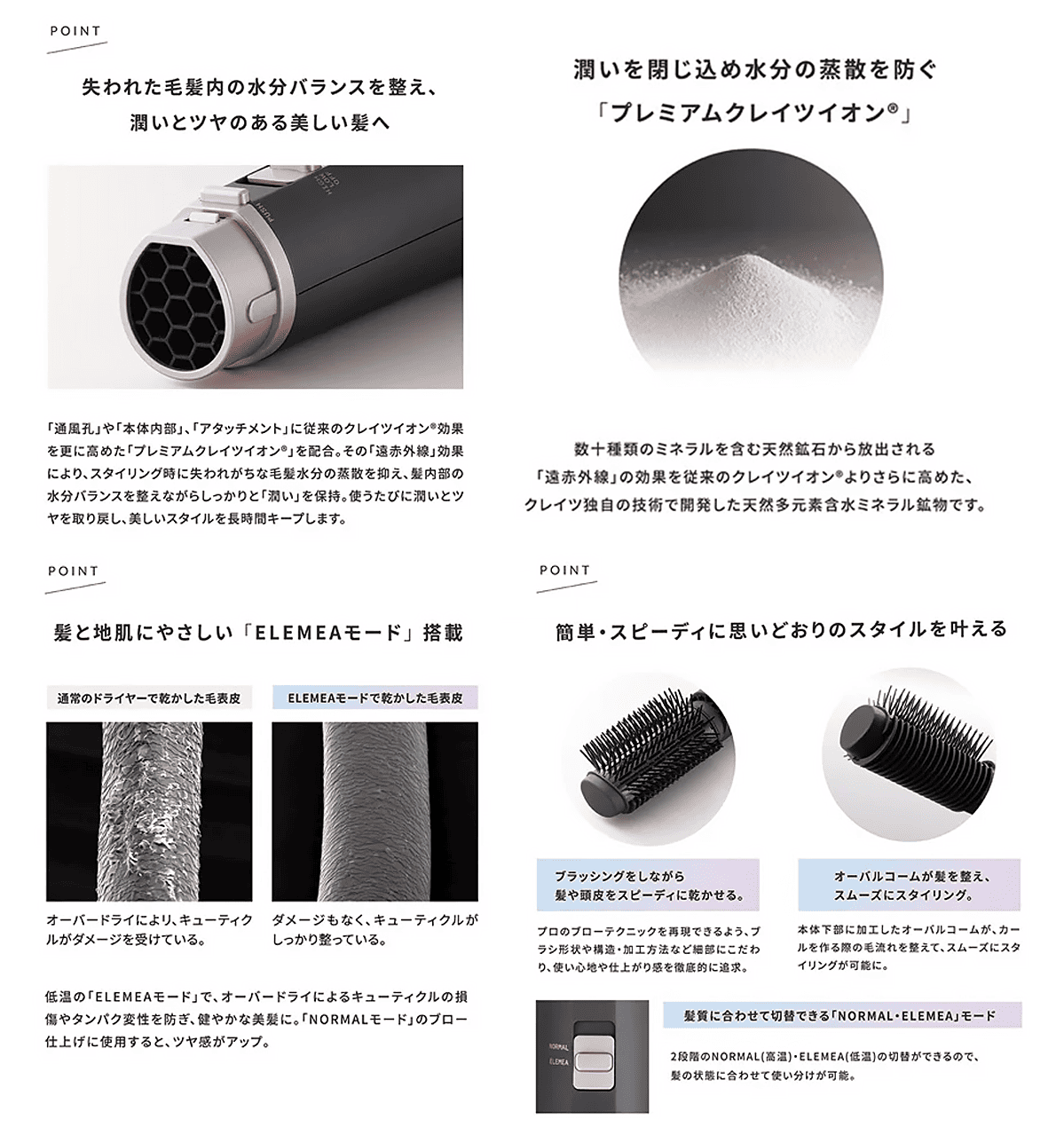 低温の「ELEMEAモード」で、オーバードライによるキューティクルの損傷やタンパク変性を防ぎ、健やかな美髪に。