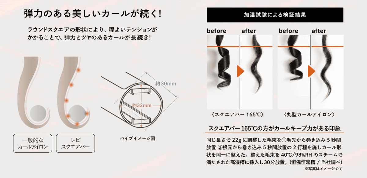 独自に開発した四角形と円形を掛け合わせた「ラウンドスクエアパイプ」搭載の進化したカールアイロンです。