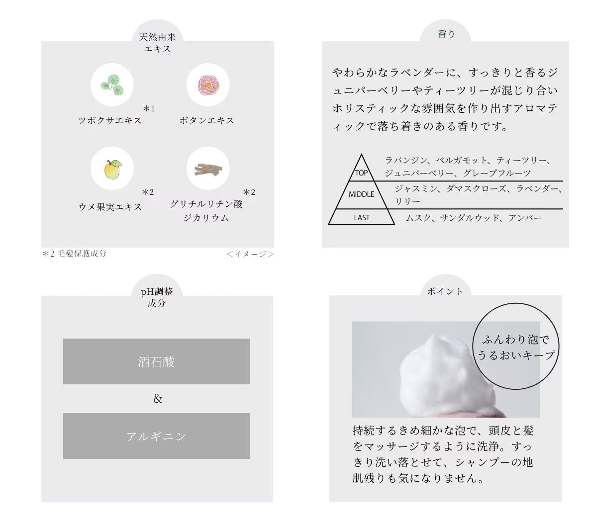 ふんわりと心地良い泡が優しく頭皮と髪をクレンジングし、トリートメントが作用しやすいベースを整えます。