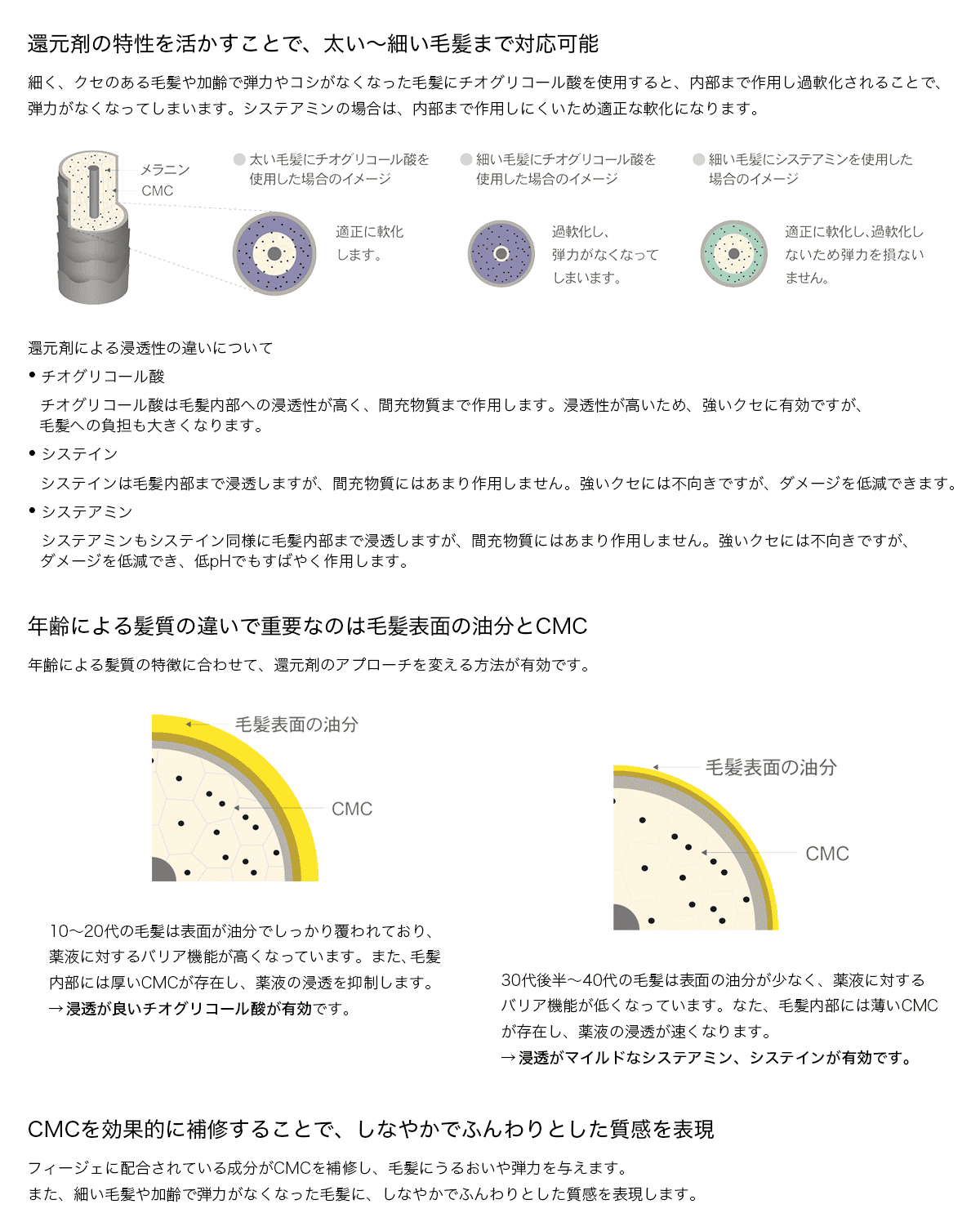 そのメカニズムを元に還元剤の特性を活かすことで、より幅広い髪質に対応することが可能になりました。