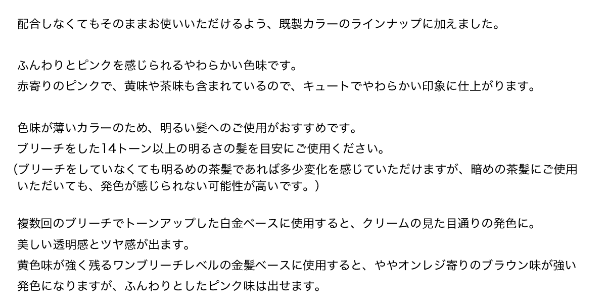 ※ダークシルバー/ココアブラウン/ココナッツブラウン はそのまま原液で使用すると、とても濃い色(暗い)のでご自宅にあるトリートメント(市販のものでもあれば何でもいい)自分の好みに薄めて使用して下さい。