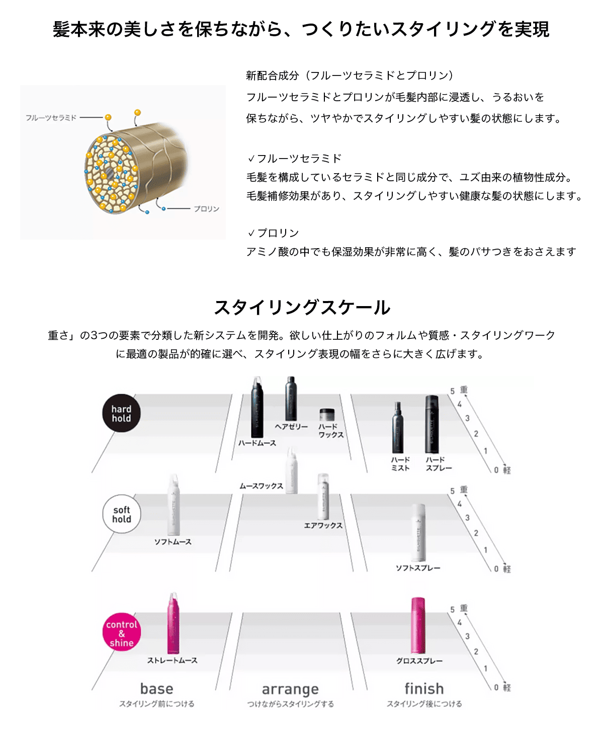 髪本来の美しさをキープしながら、あらゆるサロンスタイルに対応します。 プロにとっての使いやすさと、お客さまへのアドバイスのしやすさを両立したアイテムで、多彩なイメージで自分の魅力をアップしたいというお客さまへの、新たな提案を可能にします。