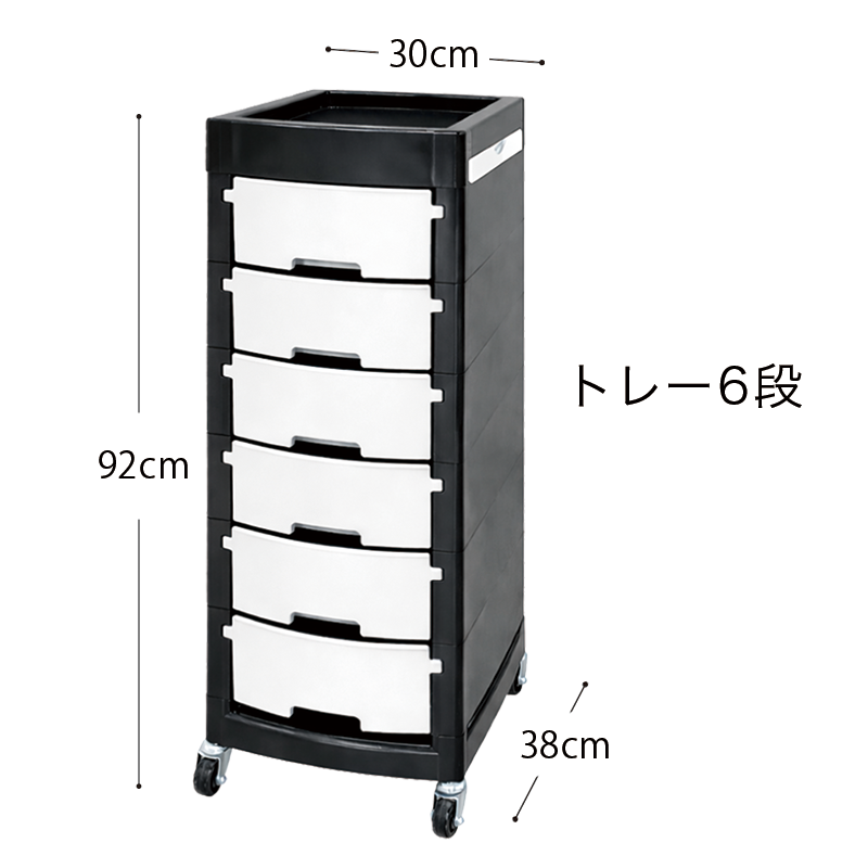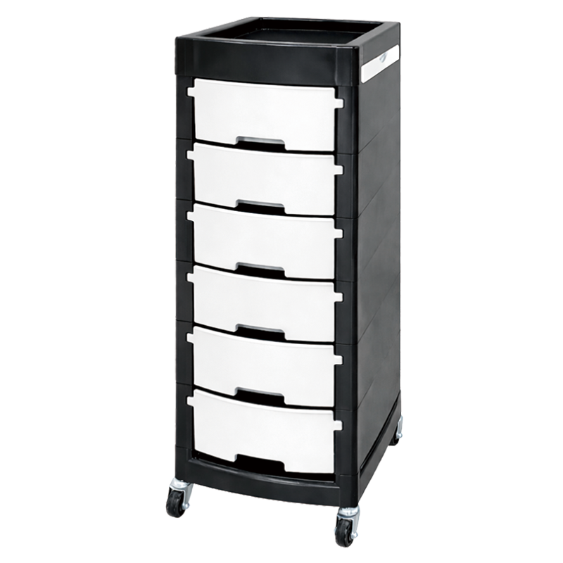 6段の引き出しとオープンスペースをバランスよく備えており、ハサミ・コーム・ブラシ・ドライヤー・カラー用品などの施術ツールを用途ごとに整理・収納できます。