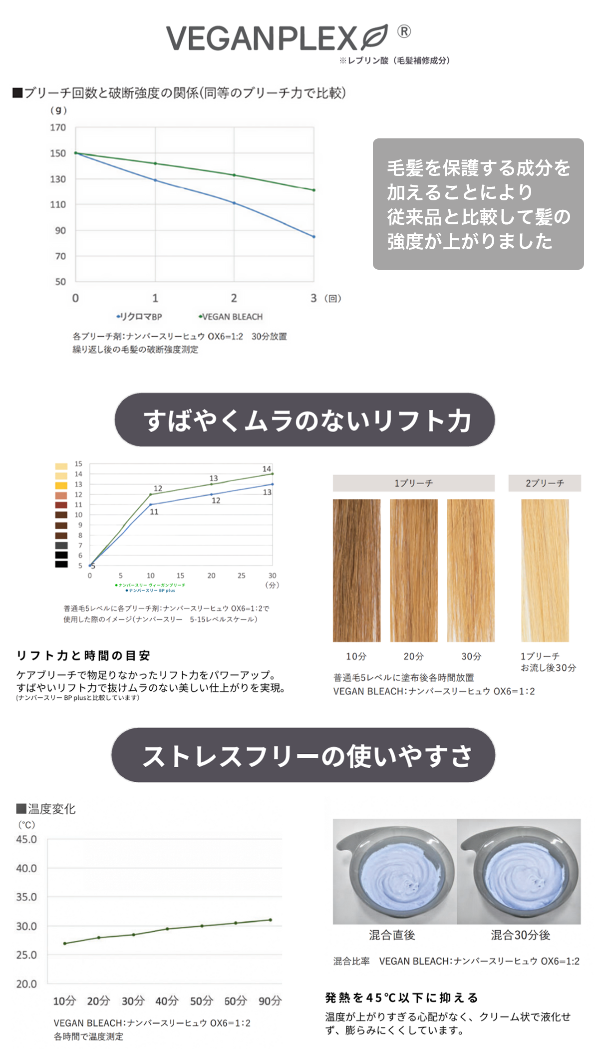 植物由来のVEGANPLEX(毛髪補修成分)配合で、リフト力をキープしながら、ブリーチ施術による過剰な酸化をしっかり抑制し、毛髪内のダメージを低減。