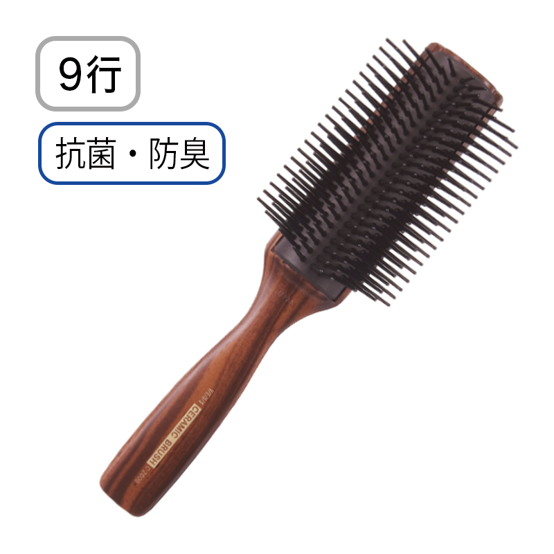 ハンドルに高級感のある木目塗装を施した9行タイプのブローブラシです。