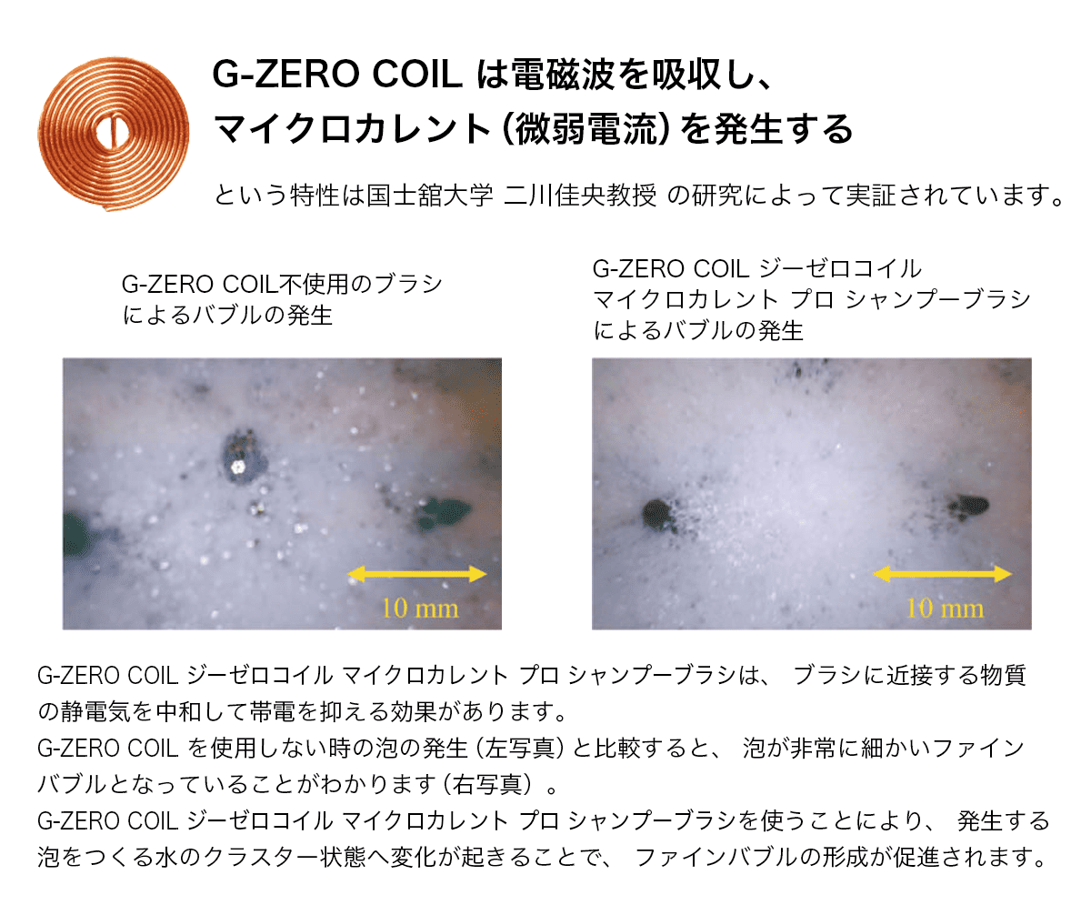 電磁波や静電気を吸収し「マイクロカレント(微弱電流)」を自然発生する“G-ZERO COIL”を搭載した、マイクロカレント・シャンプーブラシです。