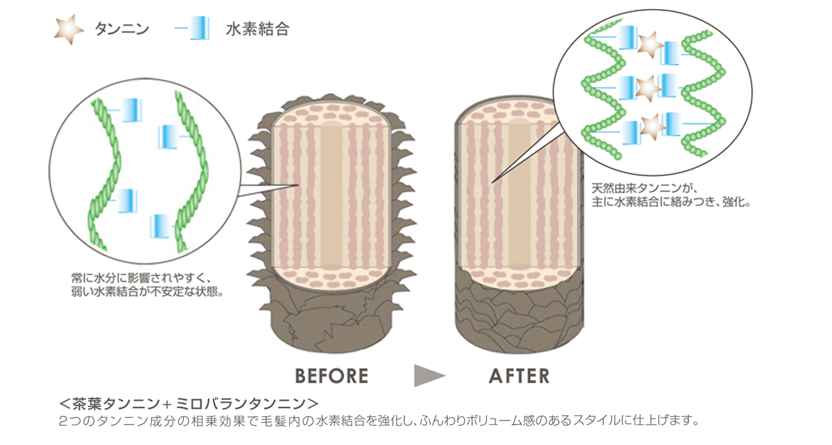 カラーリングやカラーの中間処理として使用する事で、毛髪内部の水素結合を強化して、しっかりふんわりとした髪に仕上げます。