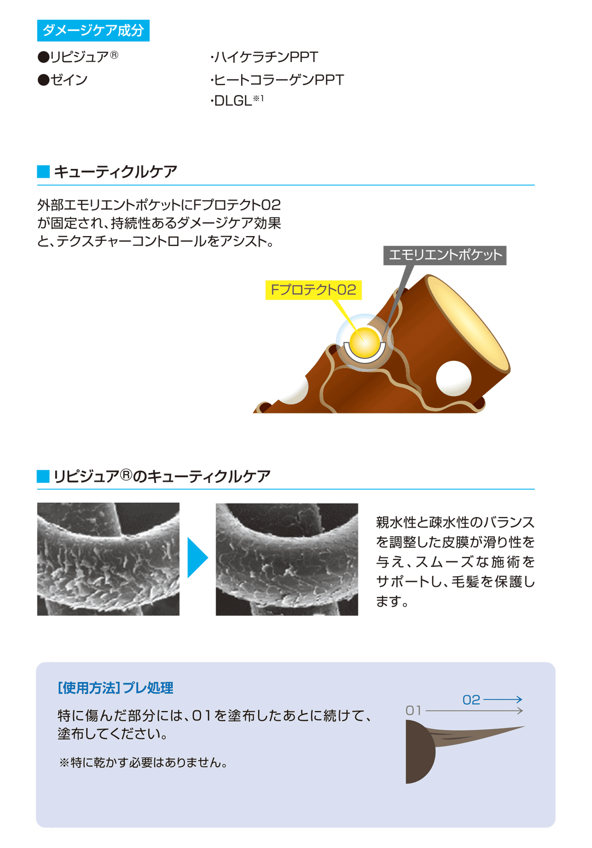 Fプロテクトは、ダメージの程度によって組み合わせ、美しいカラーとウェーブの仕上がりをサポートする、特殊トリートメントです。