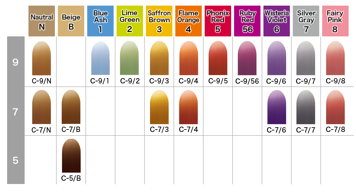 ※ 白100%の髪に基本使用で染めたことを想定したカラーチャートです。