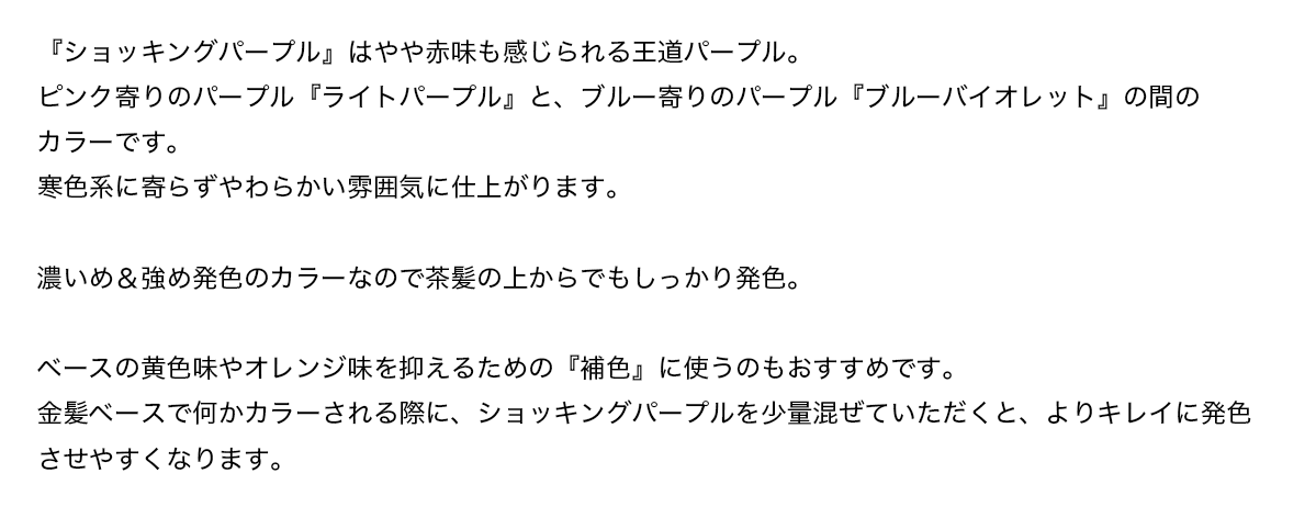 ※ダークシルバー/ココアブラウン/ココナッツブラウン はそのまま原液で使用すると、とても濃い色(暗い)のでご自宅にあるトリートメント(市販のものでもあれば何でもいい)自分の好みに薄めて使用して下さい。