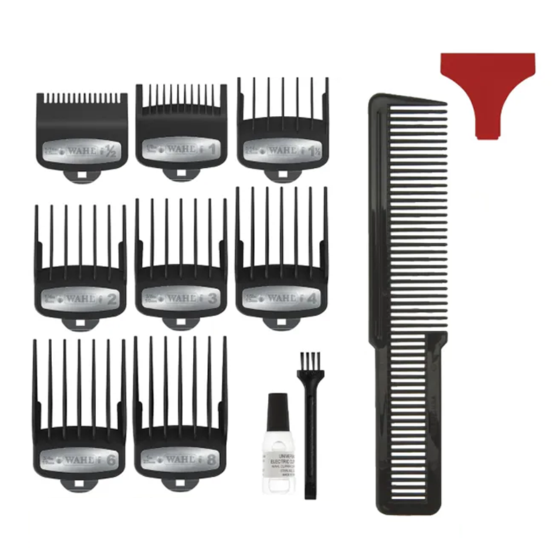 刃、プレミアム・カッティング・ガイド(1.5/3.0/4.5/6.0/10/13/19/25mm)、クリッパーコーム、 刃カバー、オイル+クリーニングブラシセット、取扱説明書(保証書含む)