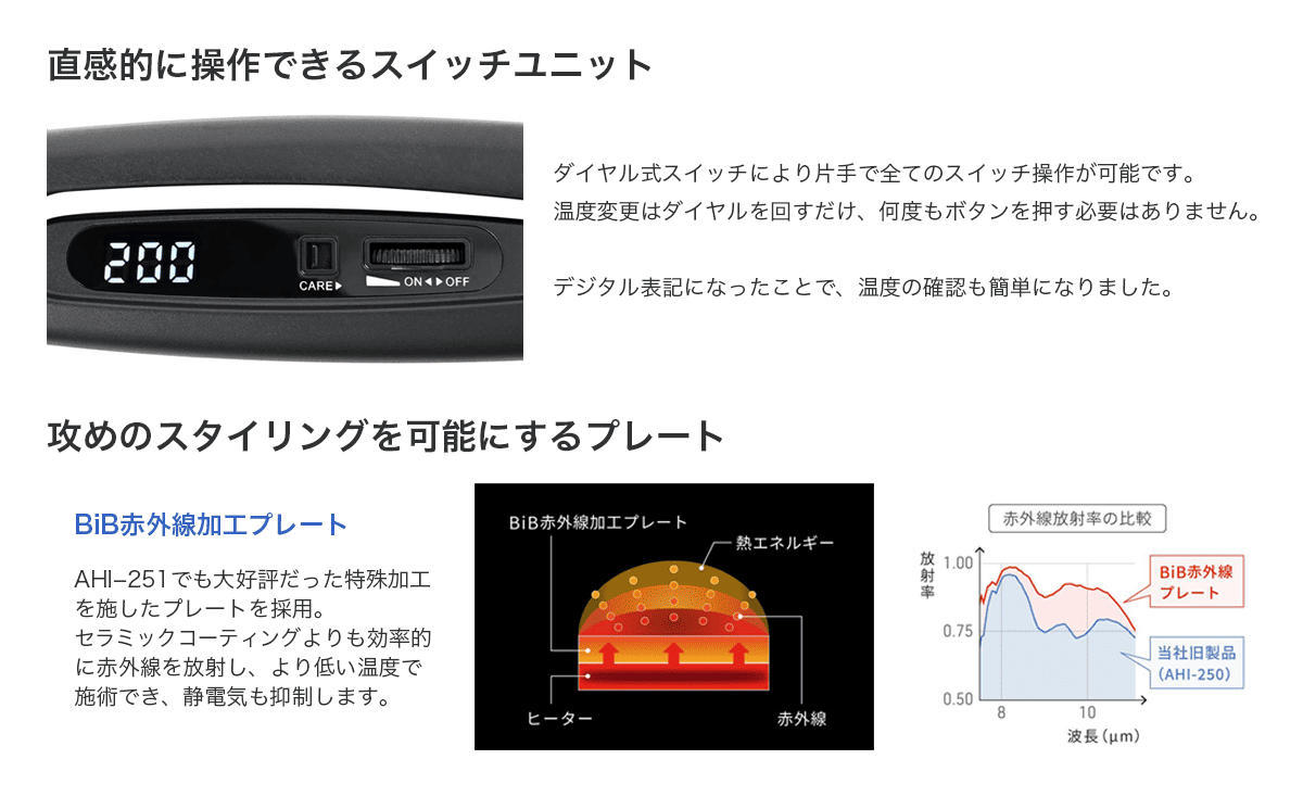 プレートはより低温施術ができるように、「マイナスイオンプレート」からAHI-252でも採用している「BiB赤外線加工プレート」に変更しました。