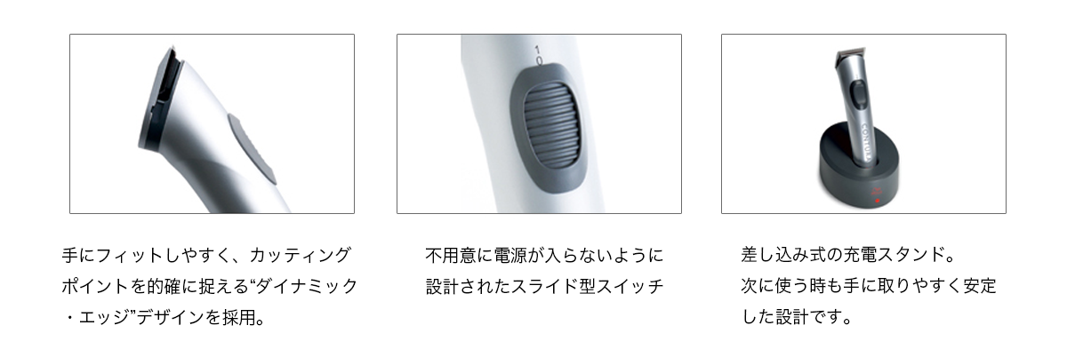 コントゥラ(=コントゥア、輪郭の意)の名のとおり、シザーではカットしきれないおくれ毛や細かい毛を軽快かつ的確にカットし、フォルムを整えます。