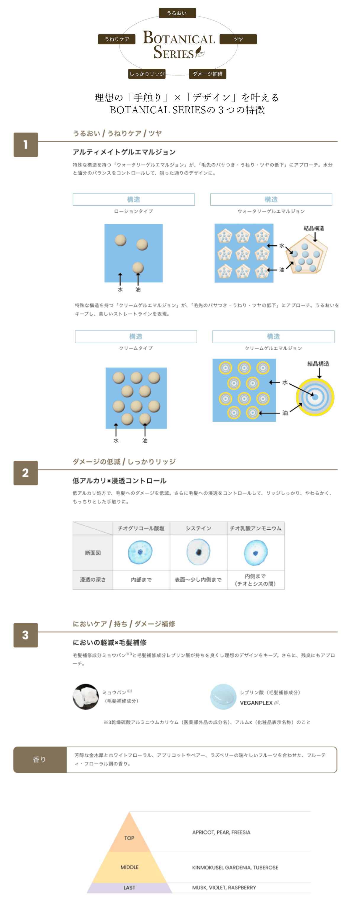 エイジング毛 特有の悩みに着目し、美しさと心地よさ、さらに、狙ったデザインの実現のために必要な「5つの要素」にアプローチしました。