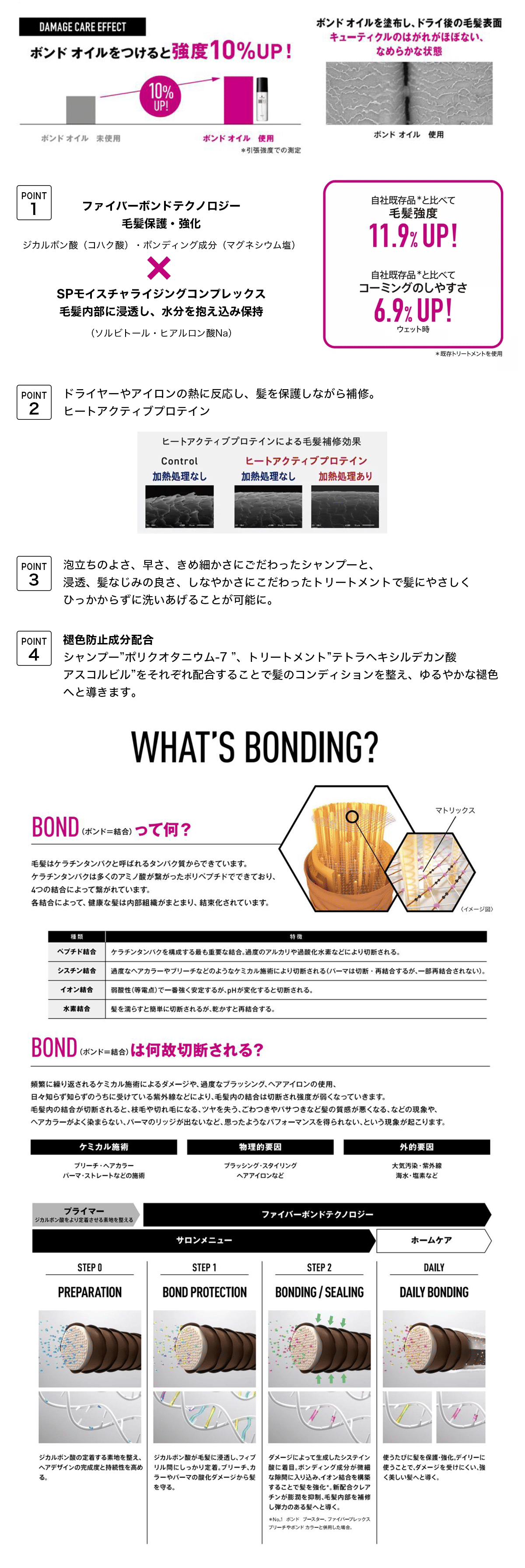 ファイバーポンドテクノロジーは、バサつく、ツヤがない、切れる、ごわつく、そんなダメージによる髪の悩みを補修で解決するのではなく、毛髪を保護・強化し、ダメージを受けにくい髪へと導くことでサポートする革新的テクノロジーです。