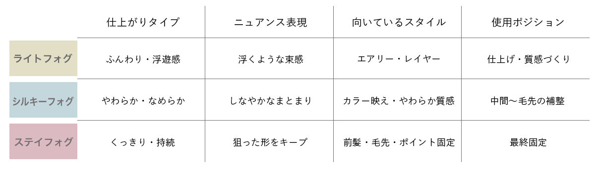 軽やかなミストが髪をやさしく包み込み、空気を含んだようなふんわり感や、浮くような繊細な束感を演出します。