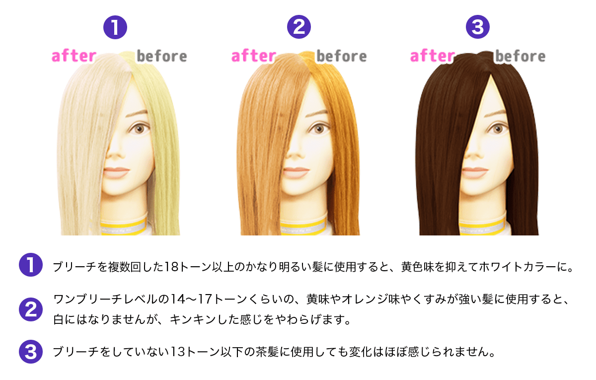 ※ 紫に染まるわけではなく、ブリーチの黄ばみとちょうど相殺するくらいの薄い色味です。