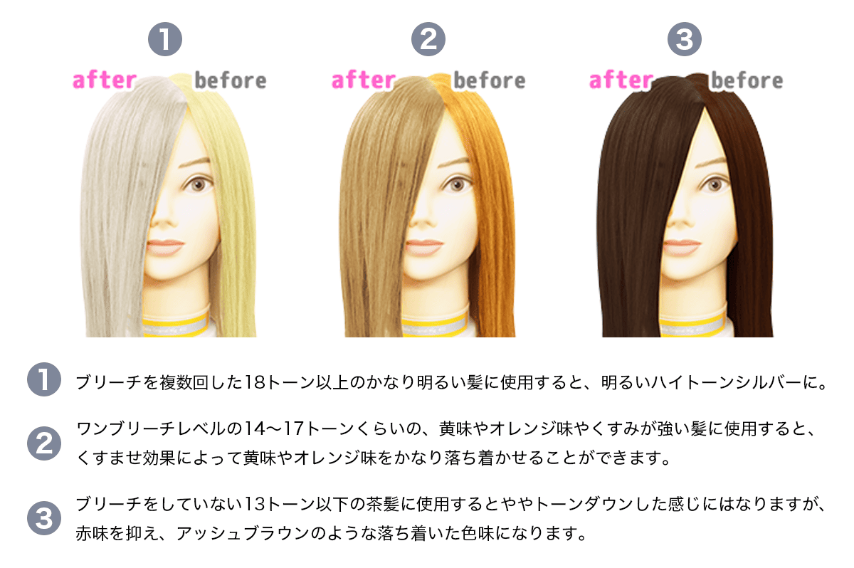 金髪の黄色味を抑え、金髪・茶髪の赤味やオレンジ味を落ち着かせる。