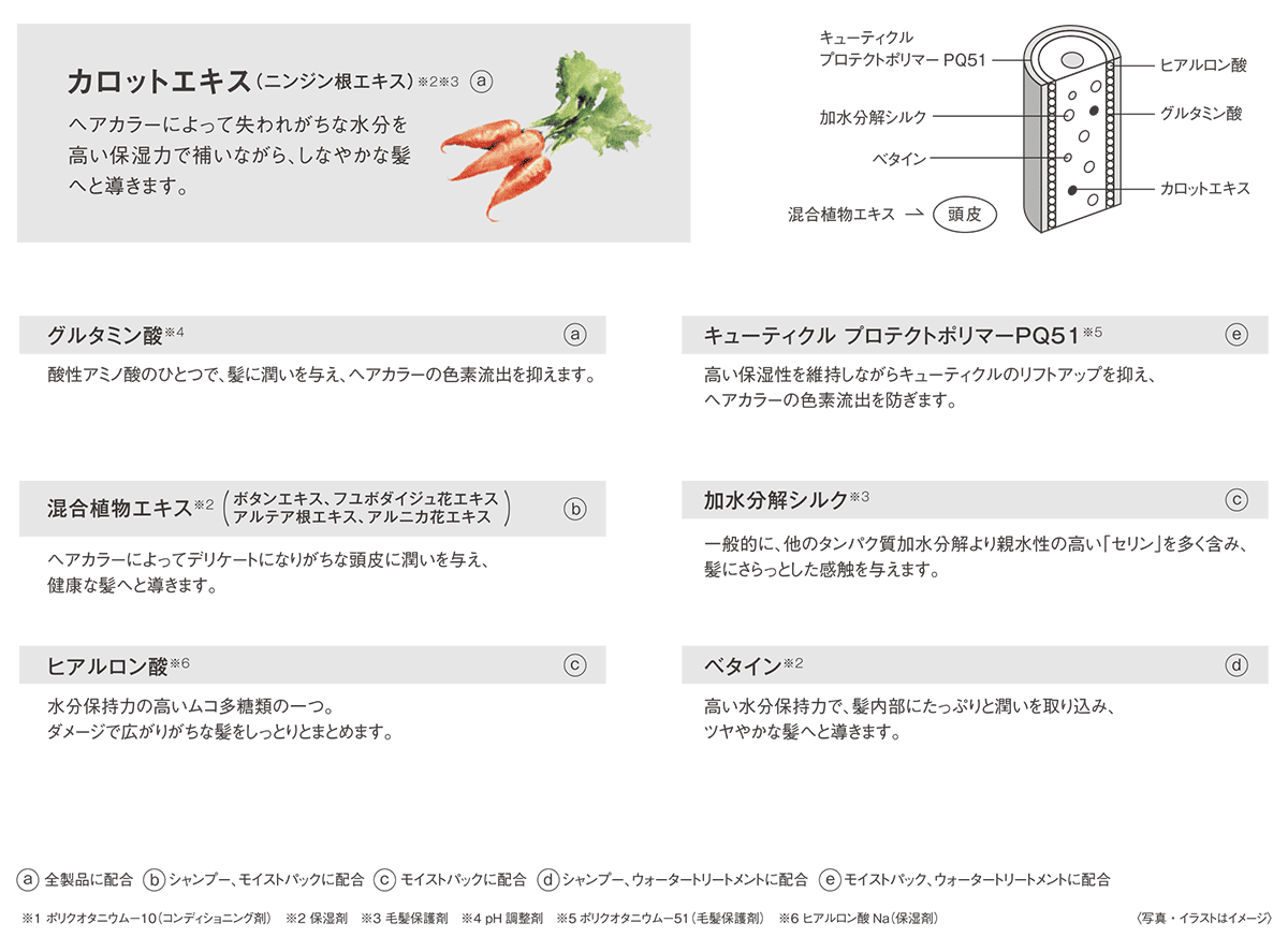ヘアカラー後の乾燥してパサつく髪や、ゴワついておさまりの悪い髪をやさしく保護しながら、カラーヘアの色合いを長期間キープします。