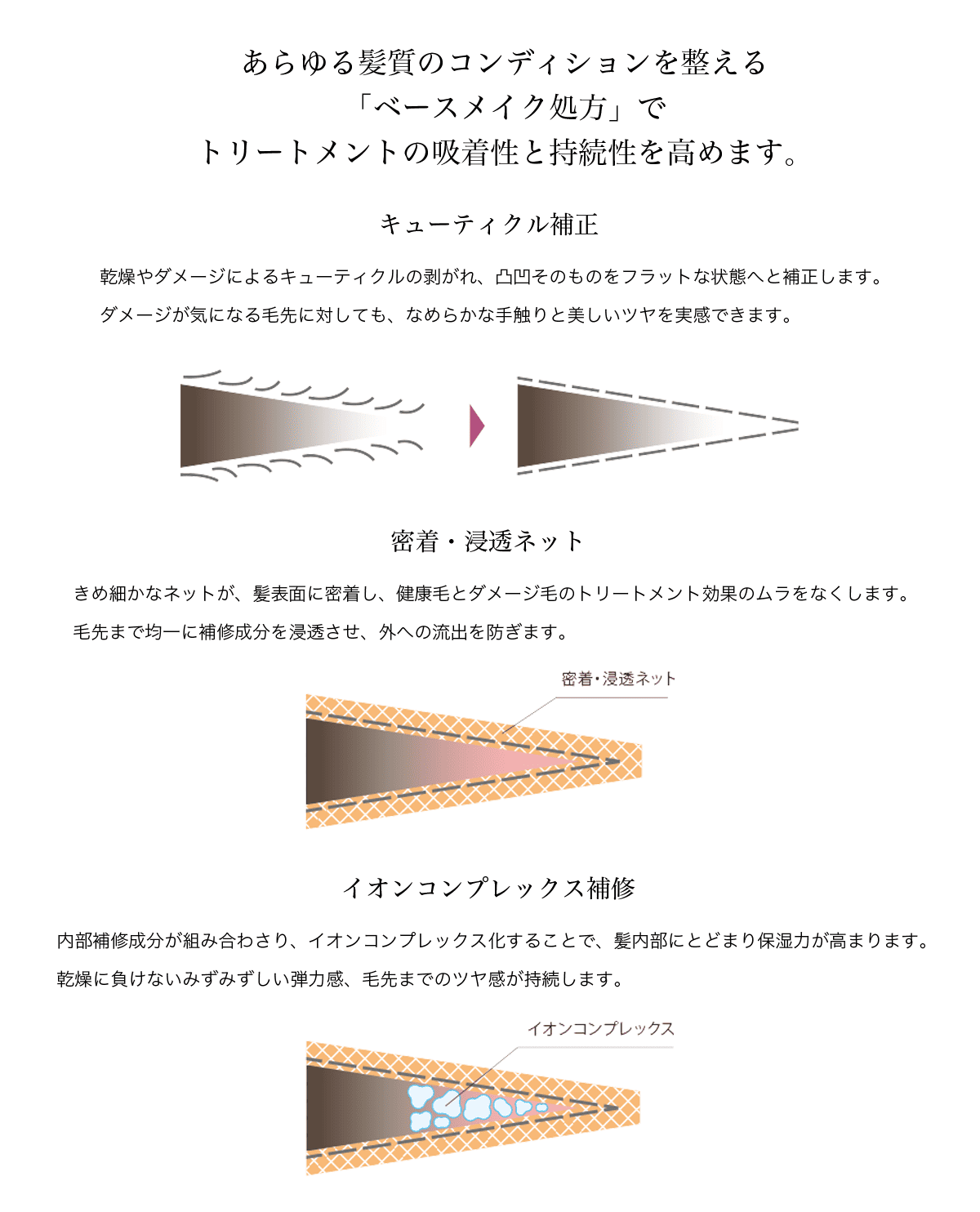 新開発「ベースメイク」処方で、あらゆる髪質のベースを整えて根元から毛先まで均質な、美しく輝く髪へと導きます。