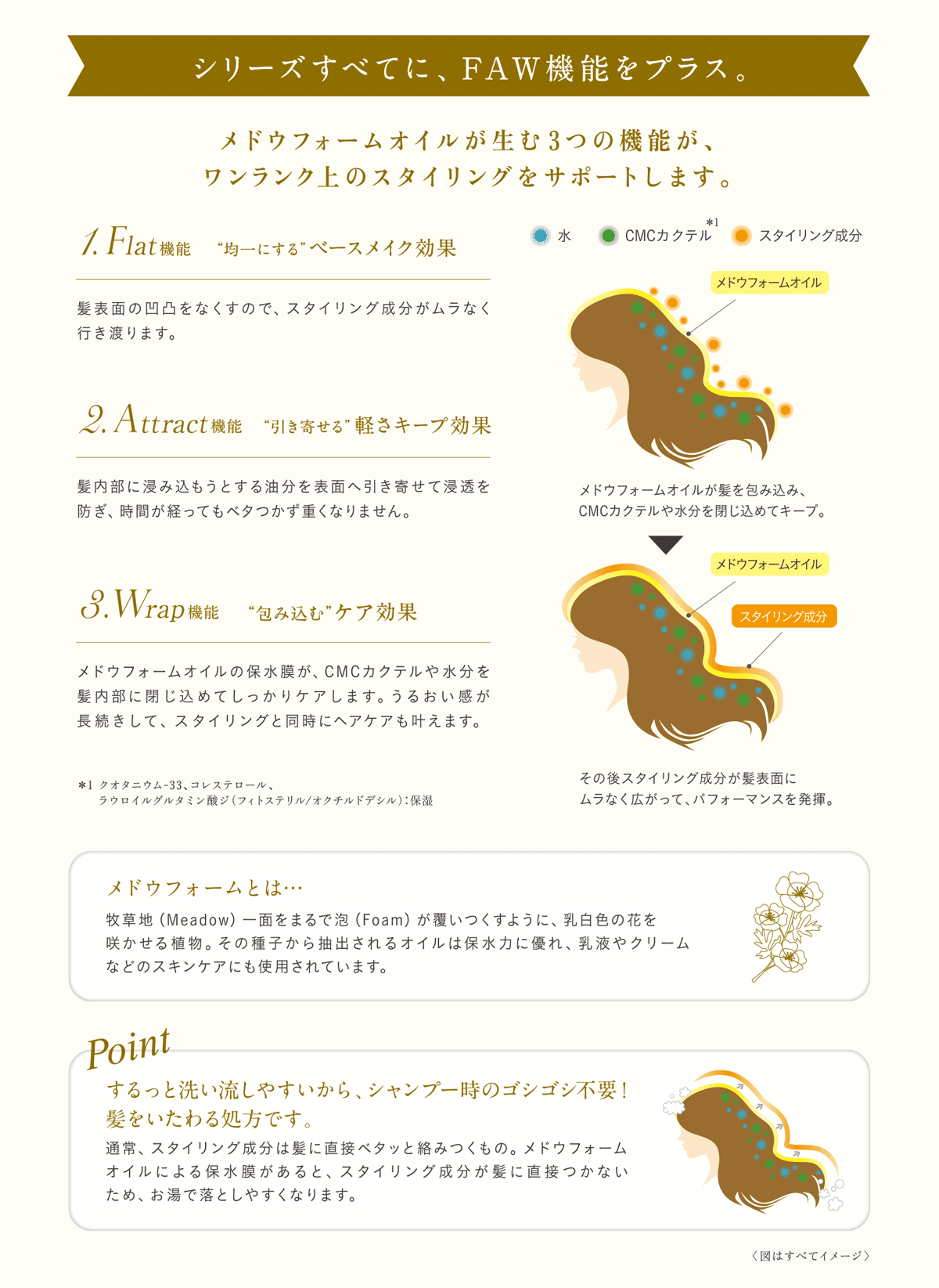 時間が経つと重さに変わりやすい油分のコントロールや、適切な水分量を保つテクノロジーで、スタイリングしたヘアデザインを長時間キープ。