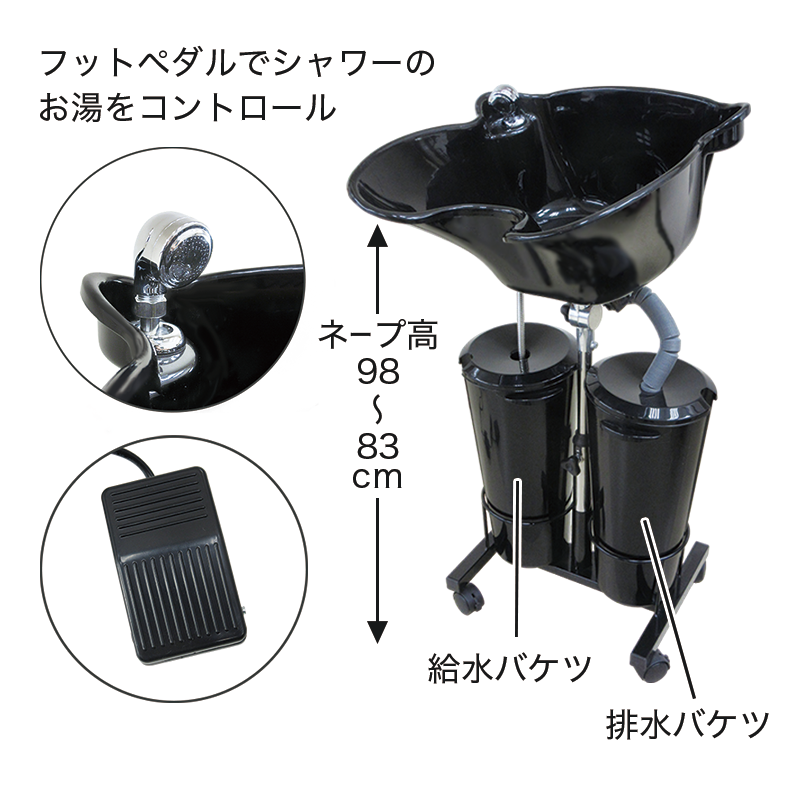 シャンプーボール付スタンド、シャワーヘッド付ホース、給水ポンプ、給水バケツ、排水バケツ、フットペダル、トランス