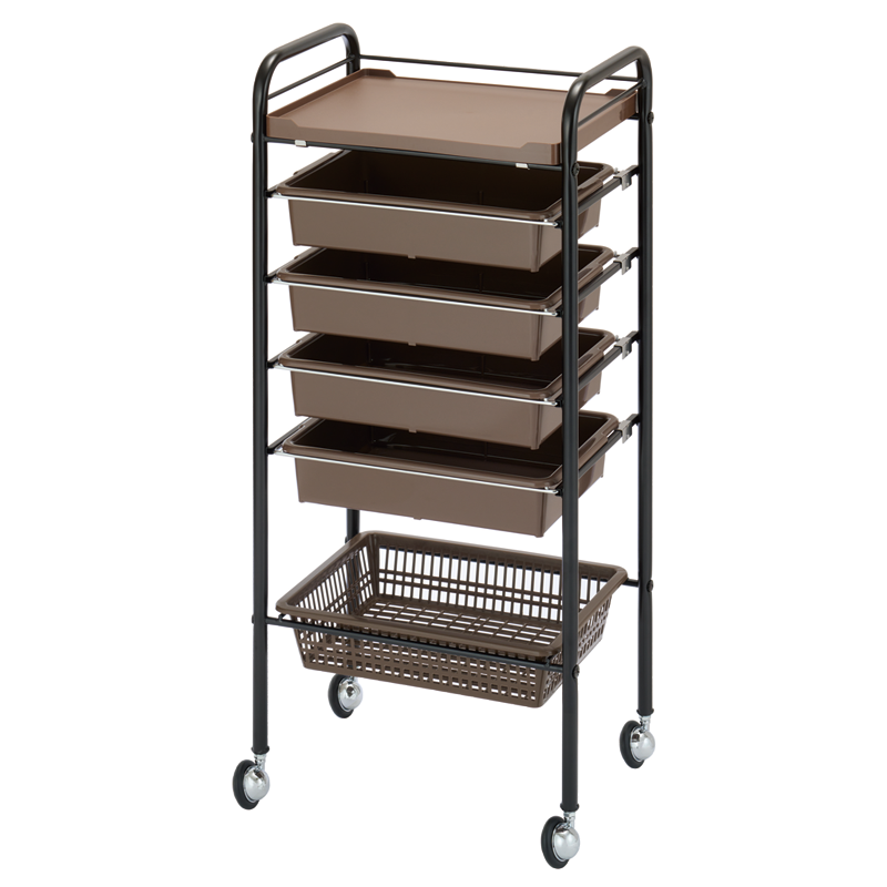 十分な収納スペースを確保した多段引き出しとオープン棚により、シザーやブラシなどの理美容ツールだけでなく、消耗品やスタイリング剤なども用途にあわせてすっきり整理できます。