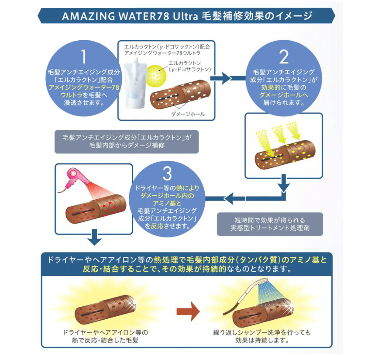 ドライヤーやアイロン等の熱で、反応・結合させることでシャンプー洗浄後も持続的なハリコシ感・ツヤ付与・すべり感等を与えることが可能です。