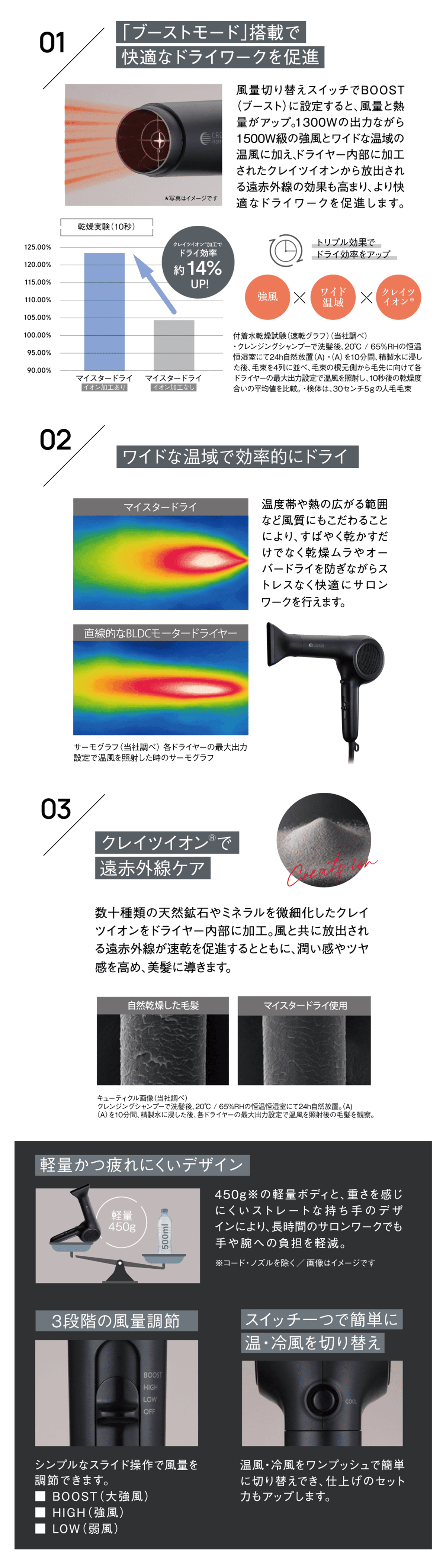 ブロードライフワークを快適に、すばやく乾かすだけでなく、効率的なドライワークにための風質、温域、美髪効果のバランスにもこだわりました。