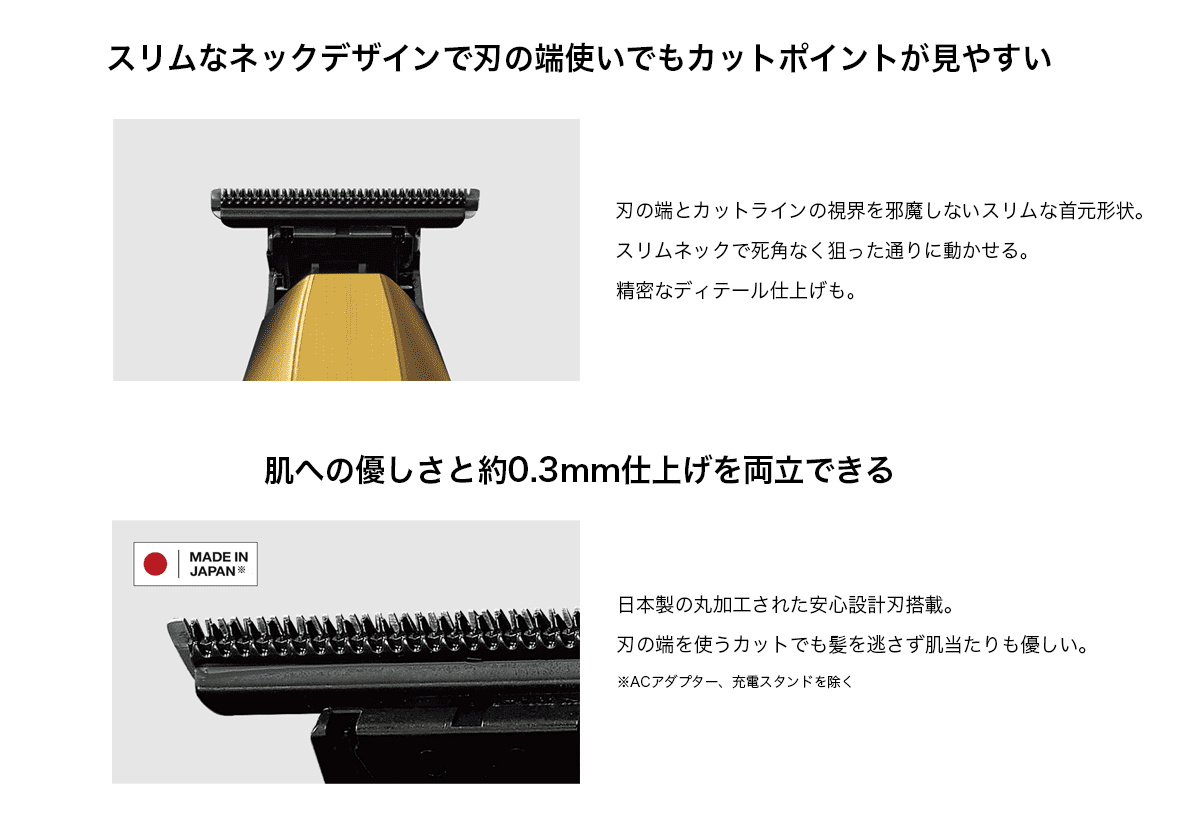 刃の端とカットラインの視界を邪魔しないスリムな首元形状。