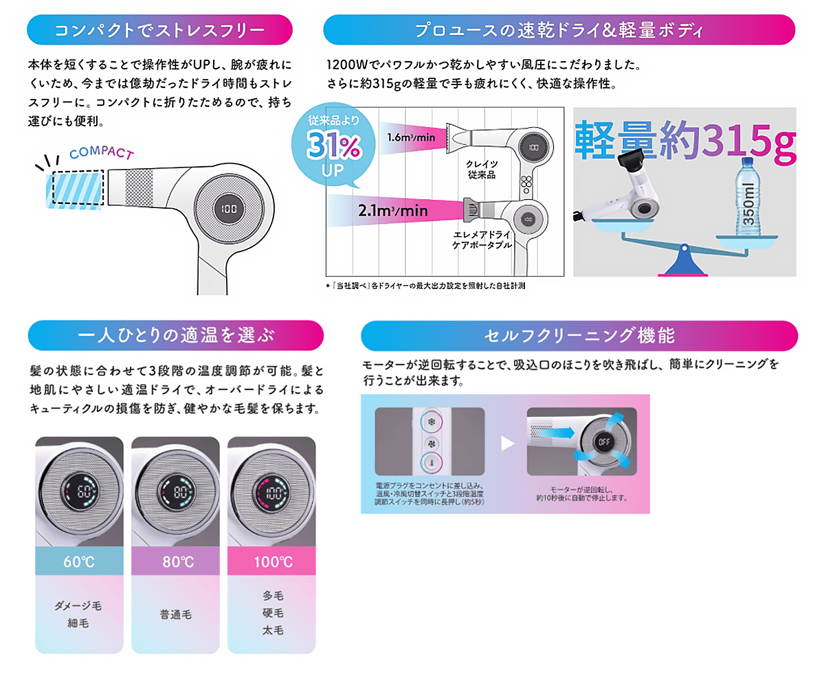 そんなニーズに応えるのが「クレイツイオンエレメアドライ ケアポータブル」です。