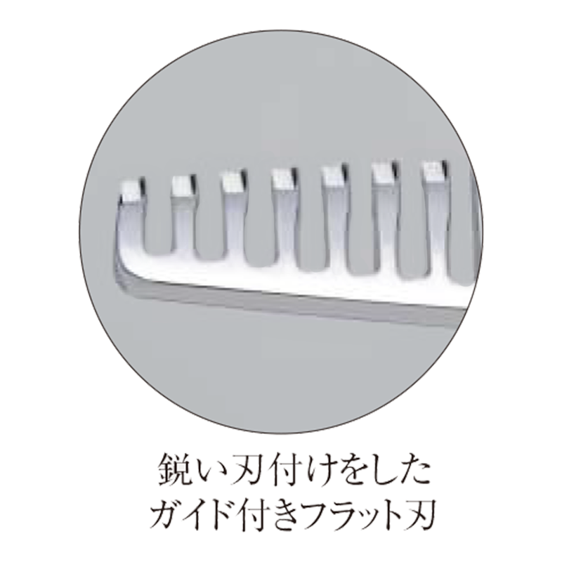 また櫛刃にフラットな刃を採用し、ハマグリ刃にする事で切った毛先を傷めないよう、カットされるお客様にも配慮。