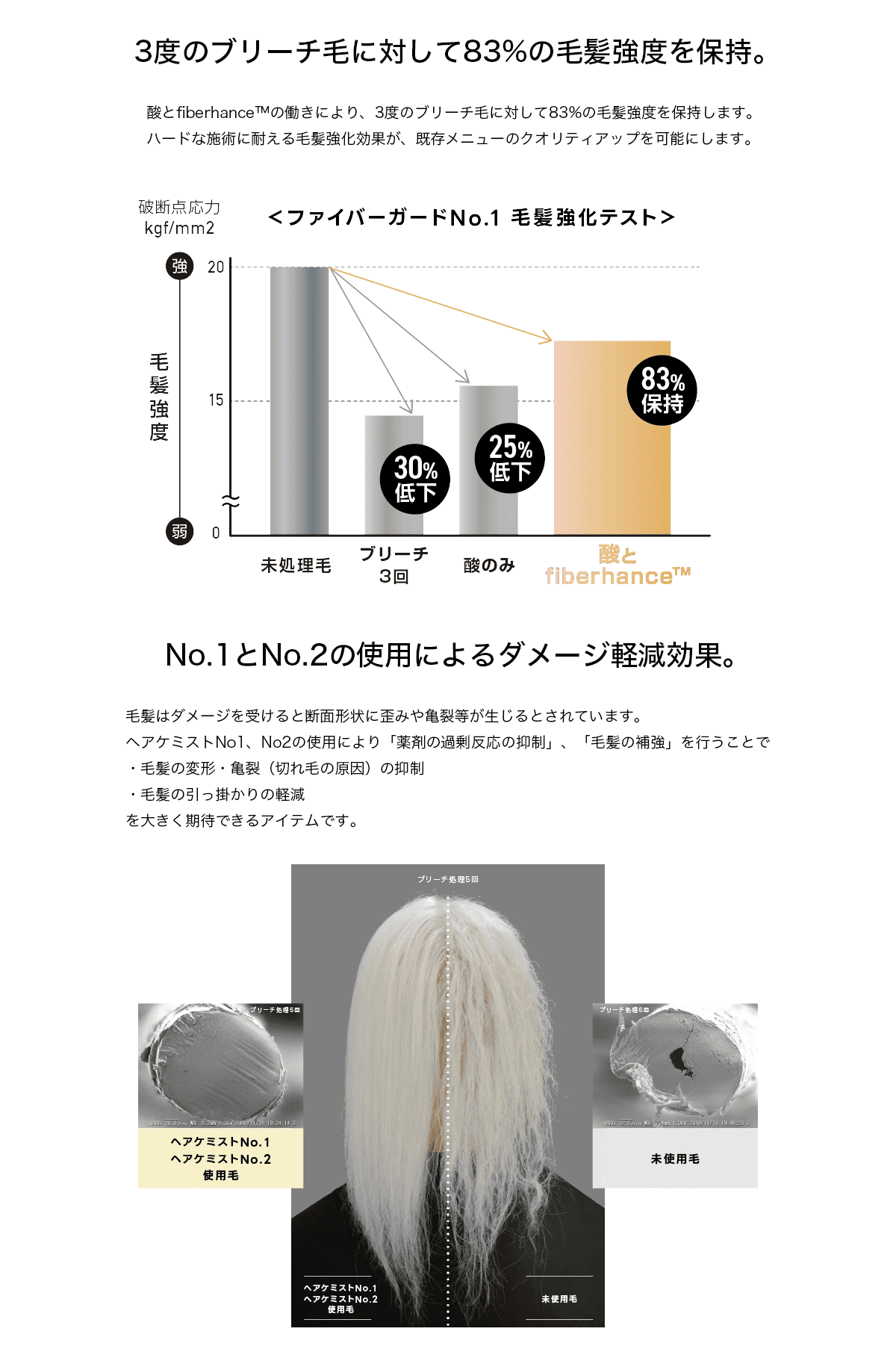 fiberhance™(補強成分)とレブリン酸が優れた毛髪補強効果を発揮し、毛髪内部補強と過剰反応抑制を同時に行います。