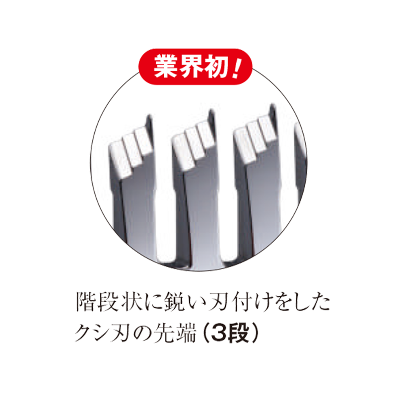 ・クシ刃の先端に段を付けて切れ味向上業界初